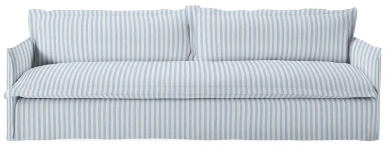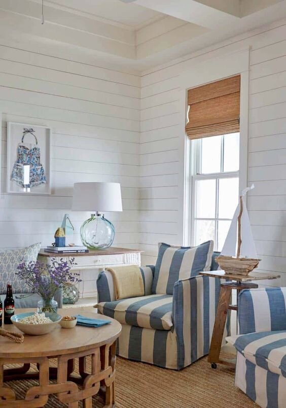 Furniture emphasizes the natural materials while blending comfort and casual elegance in Coastal style. Linen slipcovered sofas provide a practical easy to clean aesthetic, while accent chairs and tables bring texture through wood, rattan, or cane bodies. Nautical fabric patterns like stripes, palm leaves, and coral bring a sense of the seaside indoors.