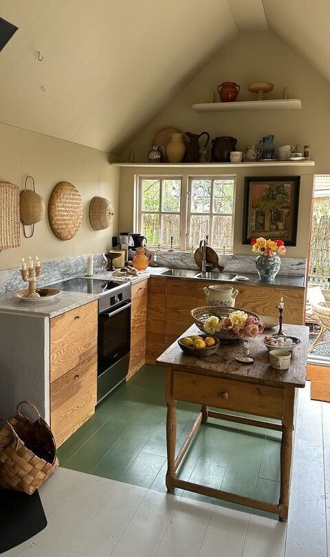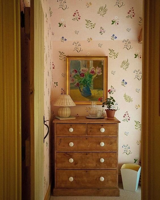Cottage Core decoration celebrates simplicity, connection to nature, and an old-world charm. Hand-made baskets to display fresh flowers or antique frames with botanical prints bring in a natural element to the walls. Ceramic jars, vases, and cups run along open shelving for ease of use, while old books and candlesticks bring in a cozy element.