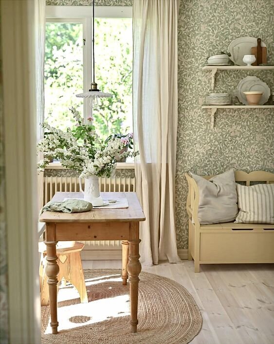 Cottage Core furniture is eclectic, hand-made, and comfortable. Second-hand finds bring character and history, like an oversized floral patterned sofa paired with an intricate wood spindle table. Cushioned seating at a window ledge or corner benches creates an intimate moment. The mix of type and style of furniture allow for some whimsy.