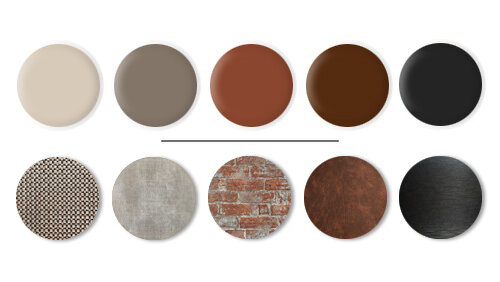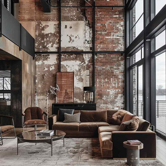 Interior finishes are the staple to Industrial style to showcase the beauty of unfinished materials. From concrete columns, reclaimed wood floors, raw steel beams, distressed brick walls, and patinated metal details, each element celebrates its authentic state. Aged leather and perforated steel provide a layer of softness and texture, while black metal and marble counters provide a modern contrast.