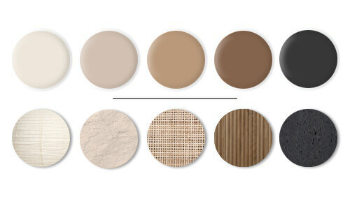 Japandi interior finishes are soft, textural, and create a harmonious blend of natural elements. Light woods like oak or ash paired with richer woods like walnut or cedar is used for ceiling beams, flooring, or fluted wall panels. Limestone, stucco, and plaster walls with woven grass or wood caned doors provide a layer of texture to the space. Matte black detailing in window trim and hardware provide contrast.