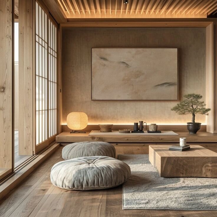 Lighting is carefully curated to enhance the serene and minimalist aesthetic and to promote a calming atmosphere. Paper lanterns are the most recognizable, along with fluted bamboo designs. Simplified design is key with soft shapes and materials, like ceramic, stone, or frosted glass with indirect lighting to create a glow of warmth.