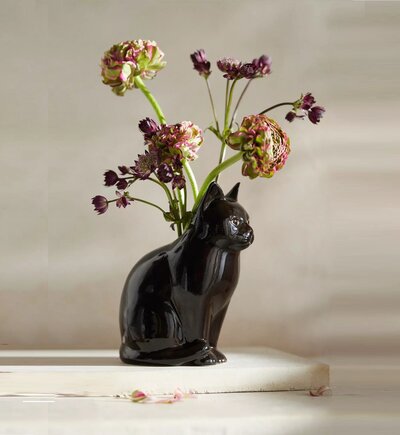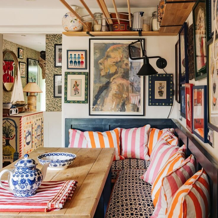 Maximalist decoration is characterized by an exuberant, eclectic, and richly layered approach. An array of mixed media artwork, curated glass-blown candlesticks, mismatched pillow styles, and quirky cat shaped vase all bring their own uniqueness to the space. Remember, nothing is too much when it comes to Maximalist decor!