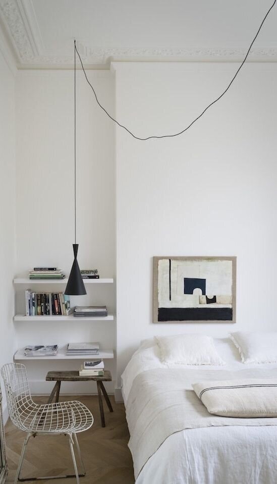 Lighting is often recessed or lightly integrated, with an emphasis on neutral tones and geometric shapes. Recessed and cove lights are seamlessly laid out to avoid notice. Frosted globe pendants create a soft glow and fade into the room. Whereas matte metal fixtures with matching shade and bases will bring a slight contrast to the room.