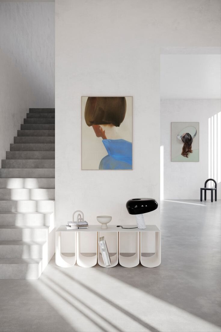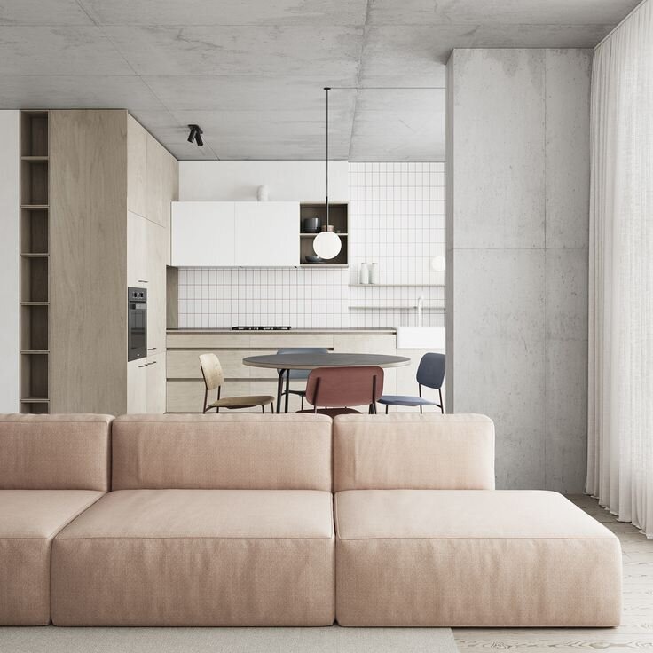 Minimalist furniture is characterized by clean lines & sleek geometric shapes that are often low-profile. Large lounge and sofa pieces are modular with angular arms and simple stitching. Accent chairs add interest with slight detailing such as a metal woven back. Whereas, side tables are often one solid form or very slender to fade away.