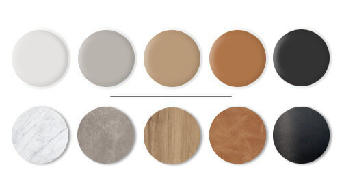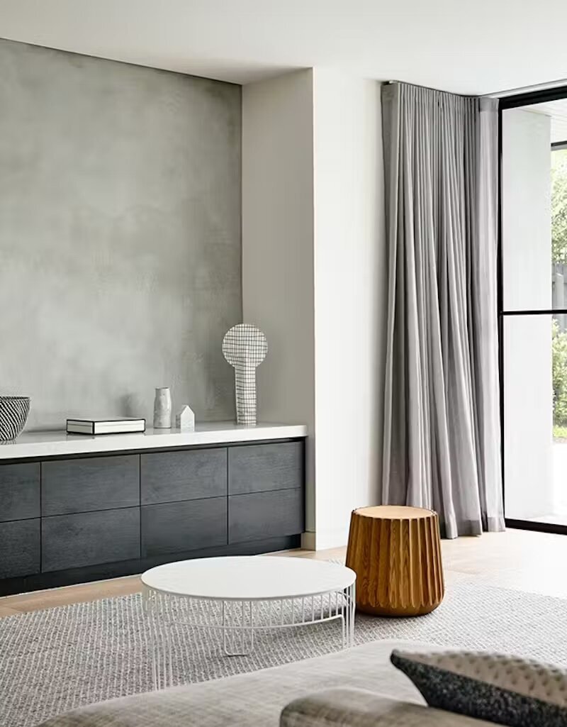 Modern finishes enhance the overall design, creating cohesive & harmonious spaces that focuses on practicality. Wall finishes vary from neutral paint, plaster, and slim wood panels, while flooring is prominently concrete or hardwood. Cabinetry is seamless panel design with marble countertops and black or stainless finishes. Leather and wool are used in textiles and rugs to soften the space.