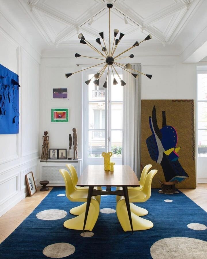 Post Modern decoration encourages creativity and self-expression to tie the eclectic space together. From large scale abstract artwork, asymmetrical sculpted vases, multicolored glass candlesticks, quirky animal figurines, family or cultural heirlooms, and oddly shaped mirrors, there is no limit to the unique playfulness of the decor.