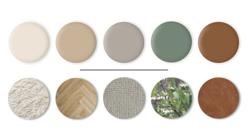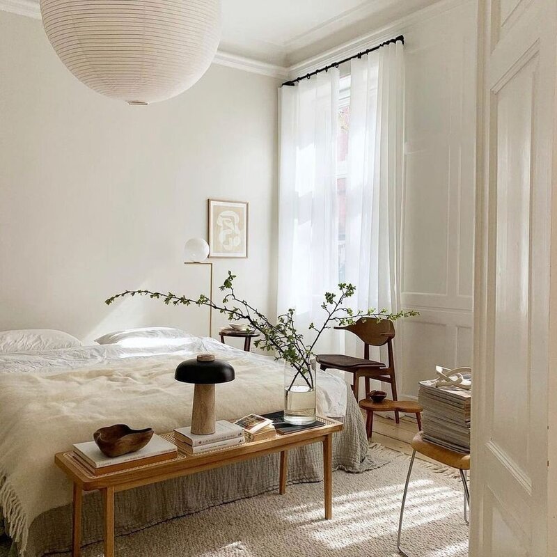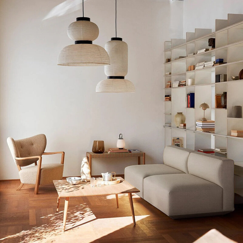 Lighting plays a crucial role in creating the warm, natural, & inviting Scandinavian atmosphere. Ambient diffused light sources like frosted glass or paper shades to create a cozy feel. Organic and abstracted forms like a flower or mushroom evoke nature, along with wood finishes and neutral colorways of green, tan, and white.